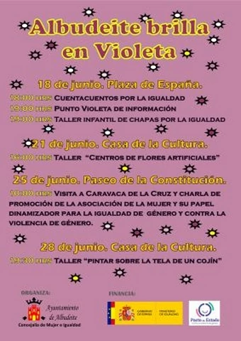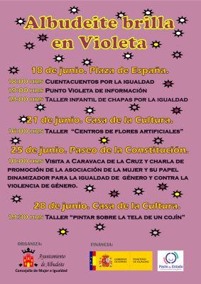 El Ayuntamiento de Albudeite, a través de la Concejalía de Mujer e Igualdad, está desarrollando el programa “ALBUDEITE BRILLA EN VIOLETA”, un conjunto de acciones cuya finalidad es la concienciación contra la violencia de género y las actitudes machistas.