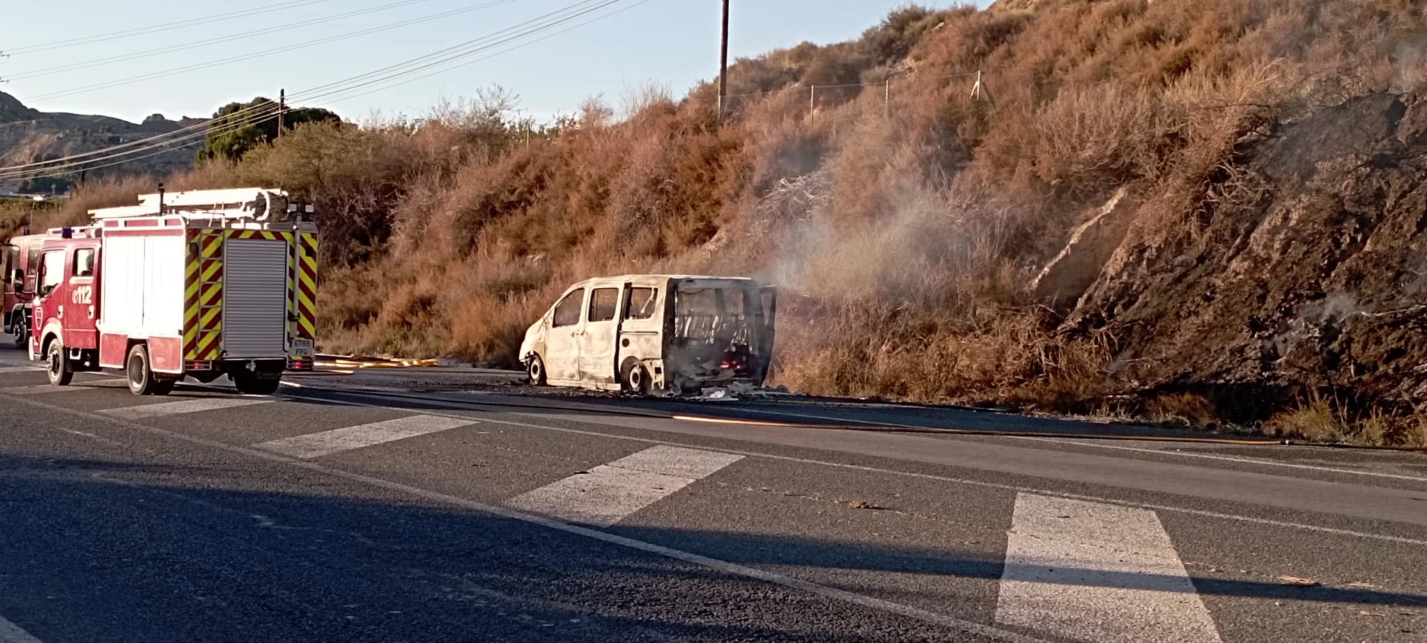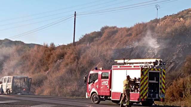 Las llamas han calcinado la furgoneta y se han propagado a los matorrales del talud de la carretera, los bomberos han procedido a extinguir las llamas tanto del vehículo como del talud.