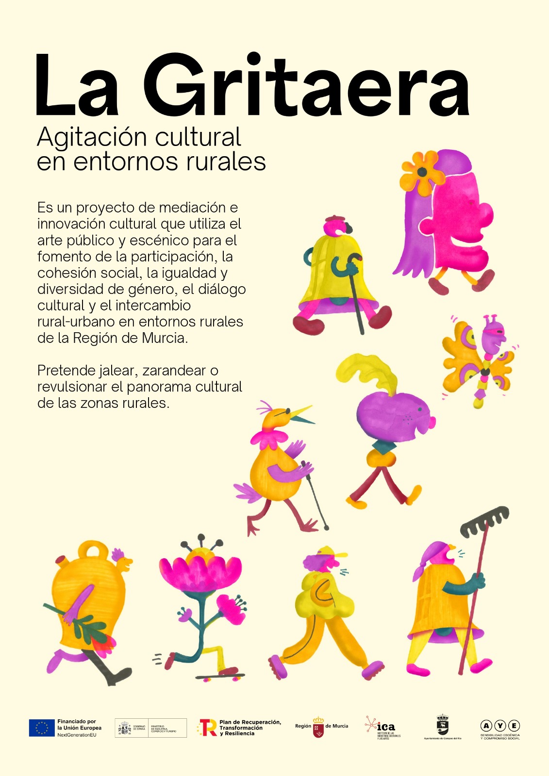 El Ayuntamiento de Campos del Río a través de la Asociación Aye Cultural pone en marcha un proyecto de mediación e innovación cultural, ‘La Gritaera’.Esta acción cultural en entornos rurales es un proyecto de mediación e innovación cultural que utiliza el arte público y escénico para el fomento de la participación, la cohesión social, la igualdady diversidad de género, el diálogo cultural y el intercambio rural-urbano en entornos rurales de la Región de Murcia.‘La Gritaera’ –palabra típica del habla huertana o del panocho que significa ‘jaleo’- pretende jalear, zarandear o revulsionar el panorama cultural de las zonas rurales.Está financiado por el Instituto de Industrias Culturales (ICA) de la Región de Murcia a través de la subvención de fondos procedentes del Instrumento Europeo de Recuperación Next Generation EU para Reactivación Económica y Social de la Región de Murcia.Junto a Campos del Río, participarán en territorios de agitación los municipios de Albudeite, Ojós y Ricote promovido por Aye Cultural Social.El proyecto contará con cuatro actuaciones entre ellos la obra de teatro ‘Rojo’ de Mireia Miracle, una feria cultural con jóvenes, una performance sobre la Igualdad de género y un taller de técnicas teatrales.
