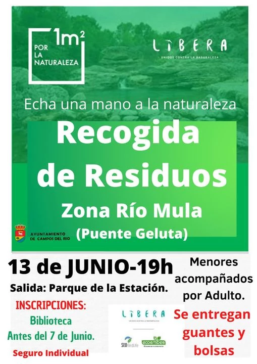 Podrán participar en la misma todos los vecinos que lo deseen previa inscripción en la Biblioteca Municipal antes del 7 de junio03.06.22. El próximo 13 de junio tiene lugar en la zona del Puente Geluta sobre el río Mula una Recogida de Residuos organizada por Libera, Unidos contra la Basuraleza, en la que colabora el Ayuntamiento de Campos del Río.La salida para esta actividad está prevista a las 19.00 horas desde el parque de La Estación y podrán participar todos los vecinos que lo deseen previa inscripción en la Biblioteca Municipal de Campos del Río antes del 7 de junio. Los menores tendrán que ir acompañados por un adulto.Con esta actividad se pretende realizar una actividad de convivencia al tiempo que se contribuye con la naturaleza, en este caso uno de los parajes de la localidad.Se entregarán guantes y bolsas a los participantes para la recogida de residuos.El proyecto Libera, Unidos contra la Basuraleza pretende frenar las consecuencias de la basura abandonada en los espacios naturales. Fue creado por la ONG SEO/BirdLife en alianza con Ecoembes.El objeto de esta iniciativa es concienciar y movilizar a la ciudadanía para mantener los espacios naturales libres de basura y liberar mucha más vida en favor de la biodiversidad a través del conocimiento, la prevención y participación.El Ayuntamiento de Campos del Río dentro de su apuesta por el medioambiente y la sostenibilidad de los espacios naturales del municipio apuesta por colaborar con este tipo de actuaciones para concienciar y prevenir con cooperación con todos los vecinos.