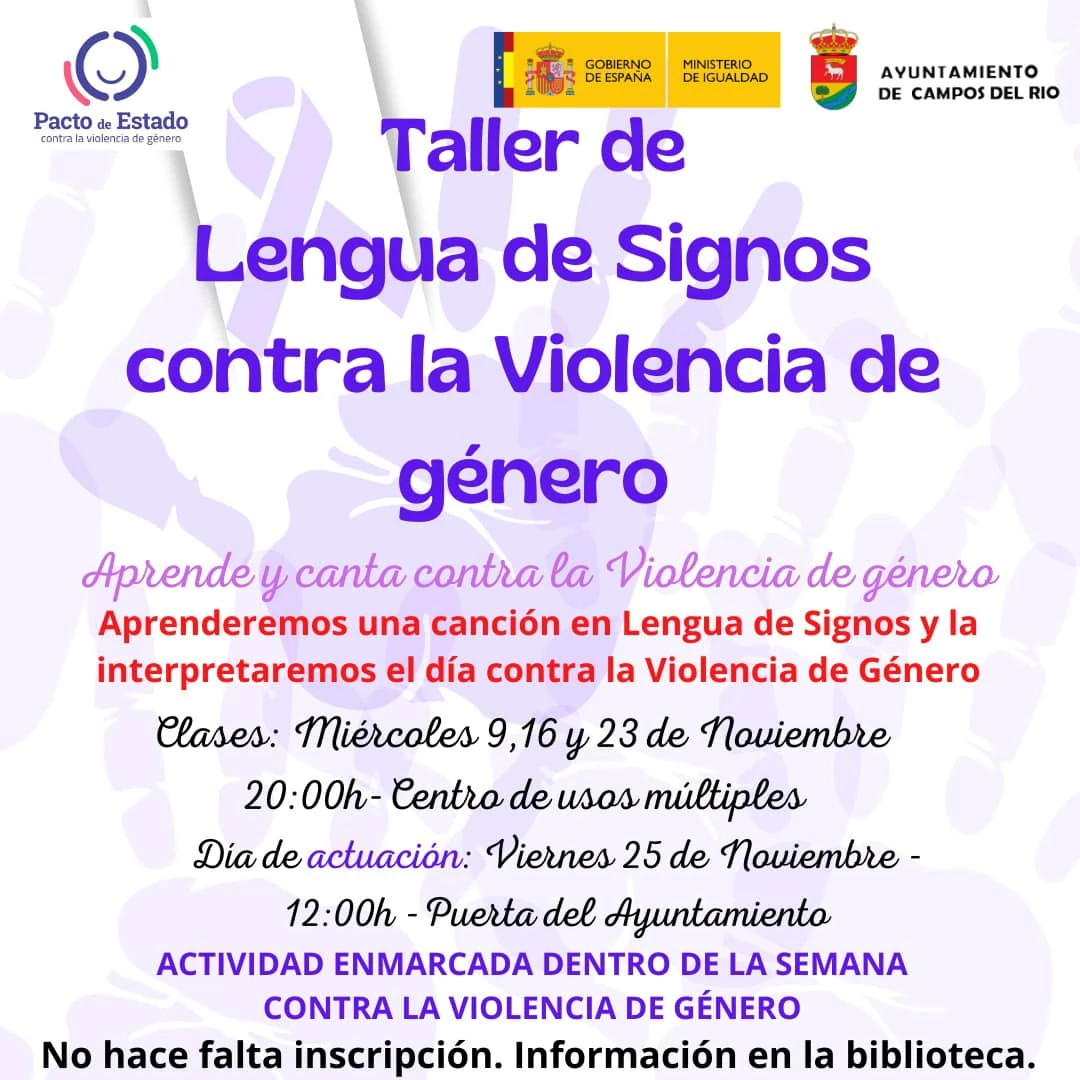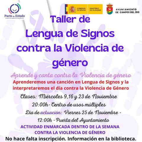 A través de esta actividad, que se impartirá los miércoles 9, 16 y 23 de noviembre, se enseñará una canción en lengua de signos que será interpretada el viernes 25 de Noviembre coincidiendo con el acto contra la Violencia de Género a las 12.00 horas en la puerta del Ayuntamiento.