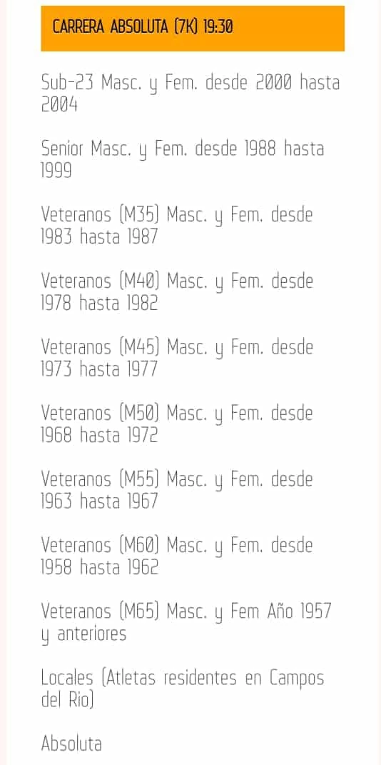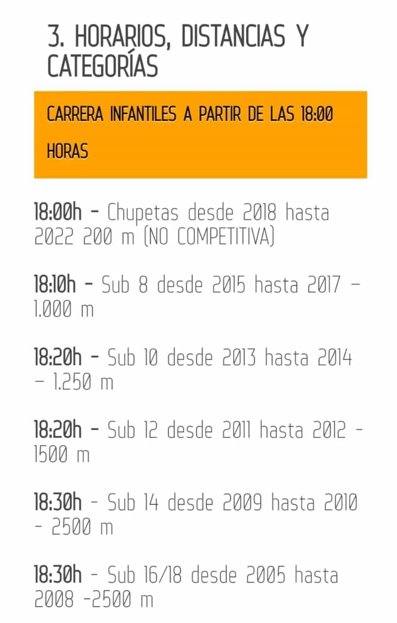 Se establecen diferentes horarios, distancias y categorías, desde las carreras infantiles que darán comienzo a las 18.00 horas hasta la carrera absoluta de 7 kilómetros que dará comienzo a las 19.30 horas.
