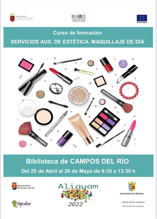 Se imparte del 25 de abril al 26 de mayo en la Biblioteca dirigido a usuarias del proyecto ALIQUAM22.04.22. Campos del Río acoge, del 25 de abril al 26 de mayo el Curso de Formación Servicios Auxiliar de Estética, Maquillaje de Día dirigido a usuarias del proyecto ALIQUAM que imparte Copedeco.El curso de impartirá en la Biblioteca de Campos del Río de 9.30 a 13.30 horas en que el participarán usuarias del programa de las poblaciones de Albudeite y Campos del RíoA través de estos programas formativos respaldados por el Fondo Social Europeo, los participantes tienen la oportunidad de aprender un oficio aportando ventajas en la empleabilidad.