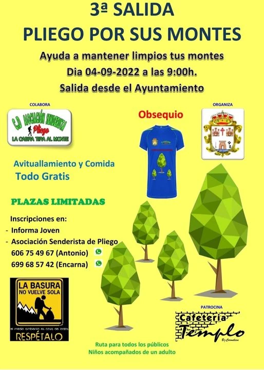 Preciosa ruta por los montes del municipio de Pliego que tendrá lugar eldomingo 04 de septiembre con salida desde el Ayuntamiento a las 09:00 de la mañana.Una estupenda iniciativa del Ayuntamiento de Pliego coordinada por la Asociación Senderista “La Cabra Tira al Monte” de Pliego, proporcionado los elementos necesarios para poder hacer una recogida de basura en nuestros senderos.La Asociación Senderista de Pliego ofrecerá a todos los asistentes durante el recorrido avituallamiento, comida y se les regalara una camiseta conmemorativa del evento.¡Participa, cuidemos nuestro entorno!