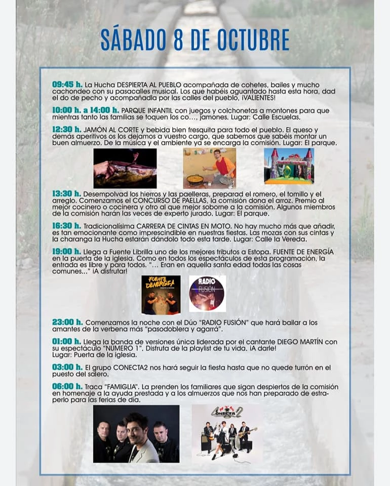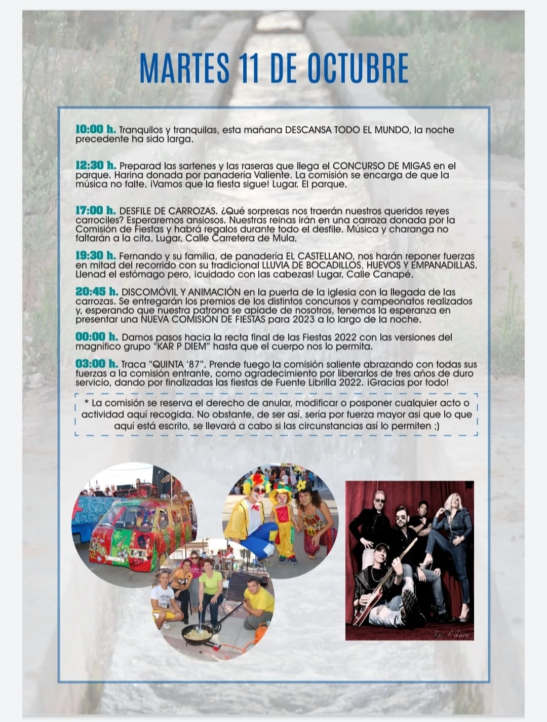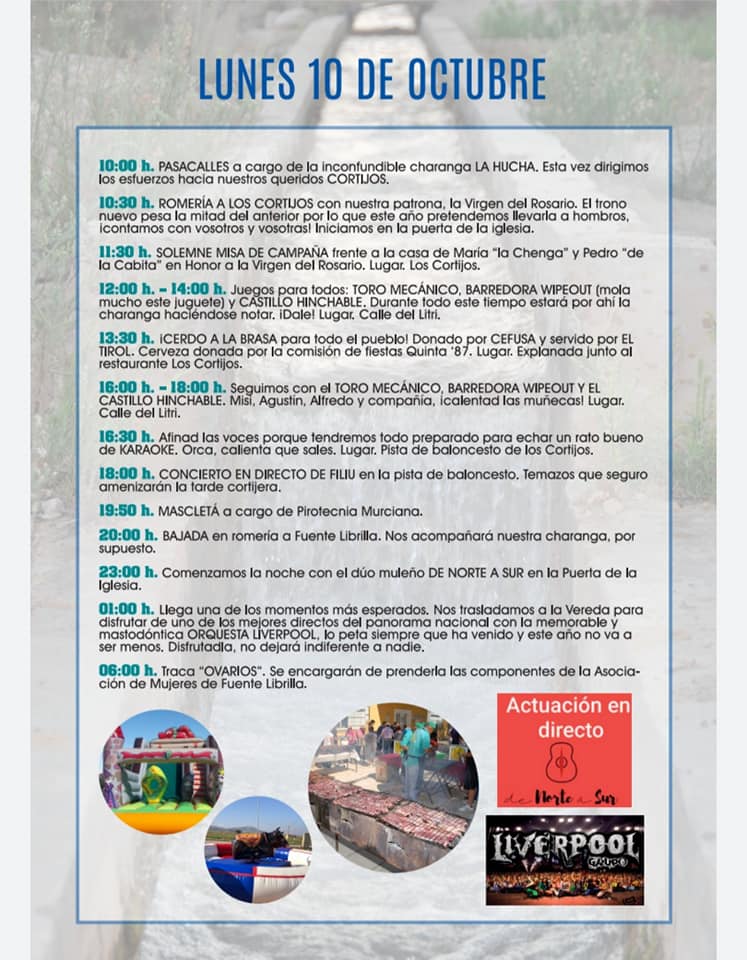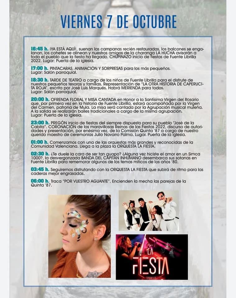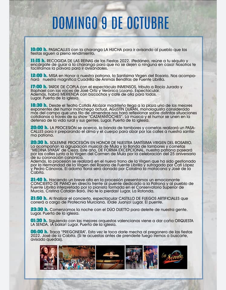 Portada y programa completo de las Fiestas de Fuente Librilla 2022. Portada y programa completo de las Fiestas de Fuente Librilla 2022. Modo de Lectura aA aA Fuente Más Pequeña Fuente Más Grande Compartir Esto Portada y programa completo de las Fiestas de Fuente Librilla 2022. Encontraréis sorpresas dentro del libro. Echadle un ojo cuando lo tengáis entre manos. ¡¡Vamos!! Artículo Anterior Programación de Fiestas de La Puebla 2022 Artículo Siguiente Albudeite- Se está llevando limpieza del cauce de la rambla a su paso por el municipio. Fuente Librilla Fiestas