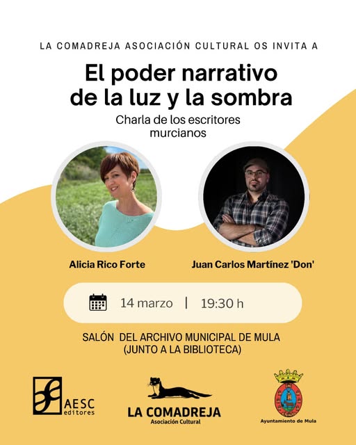 El próximo sábado14 de marzo a las 19:30 horas, el Salón del Archivo Municipal de Mula —situado junto a la biblioteca— acogerá la charla «El poder narrativo de la luz y la sombra», un encuentro literario con los escritores murcianos Alicia Rico Forte y Juan Carlos Martínez ‘Don’.