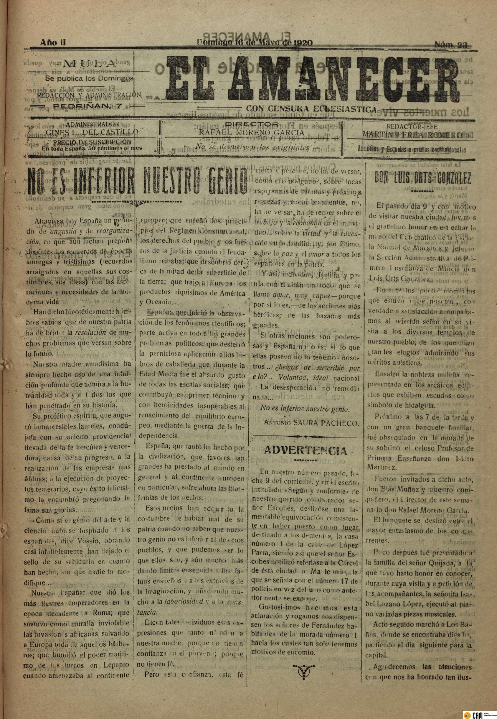 Periodico de Mula el Amanecer nº23 16 Mayo de 1920