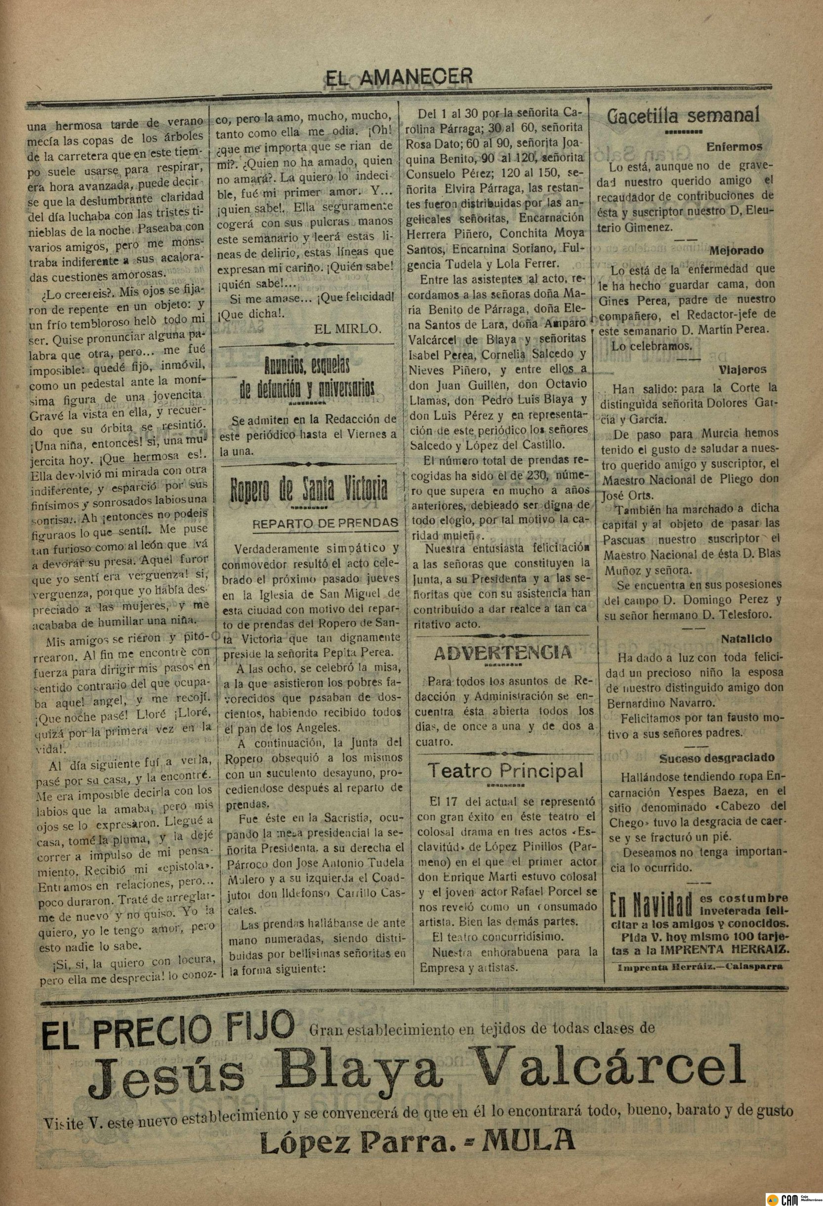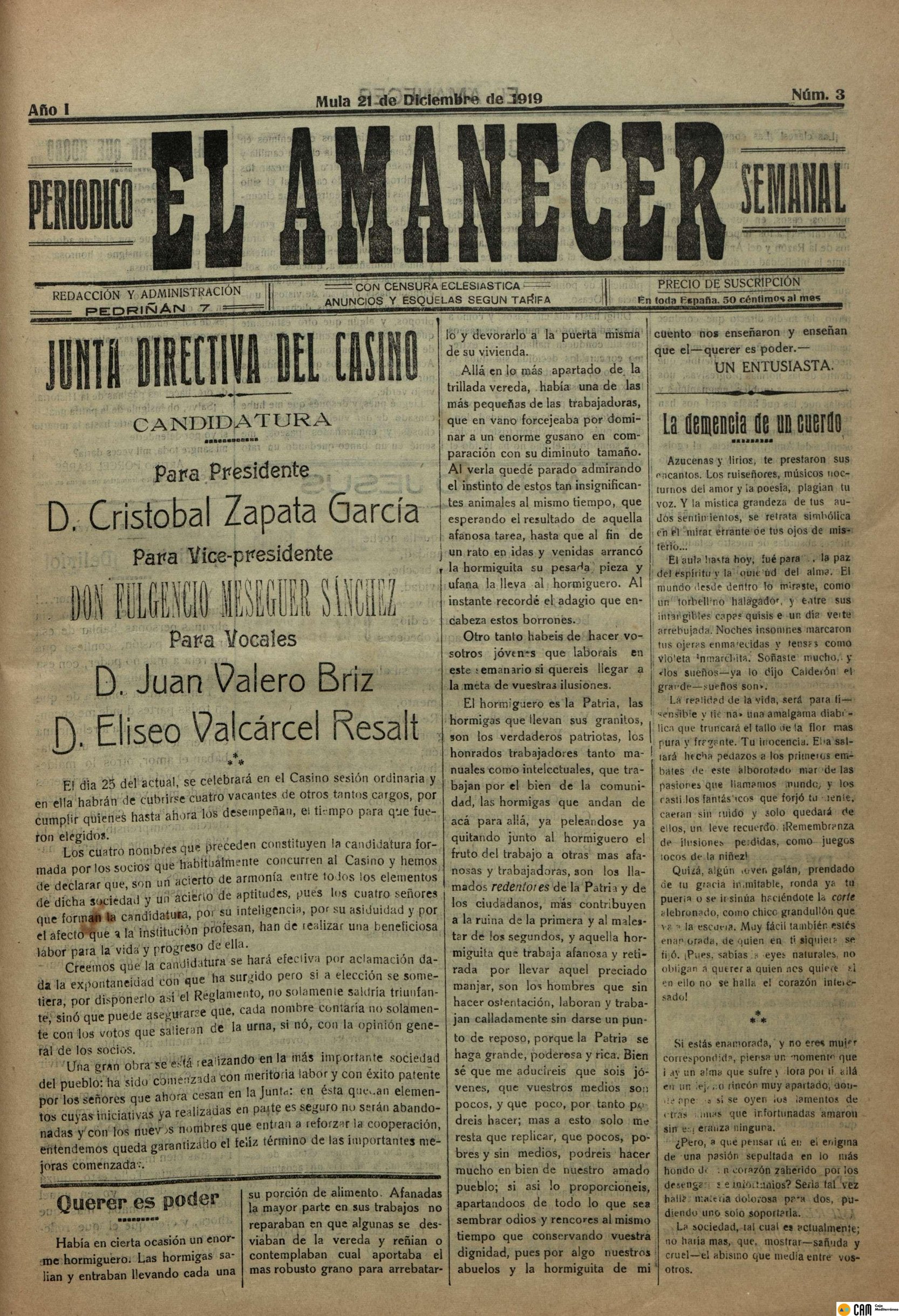 Periodico de Mula el Amanecer nº3 21 de Diciembre de 1919