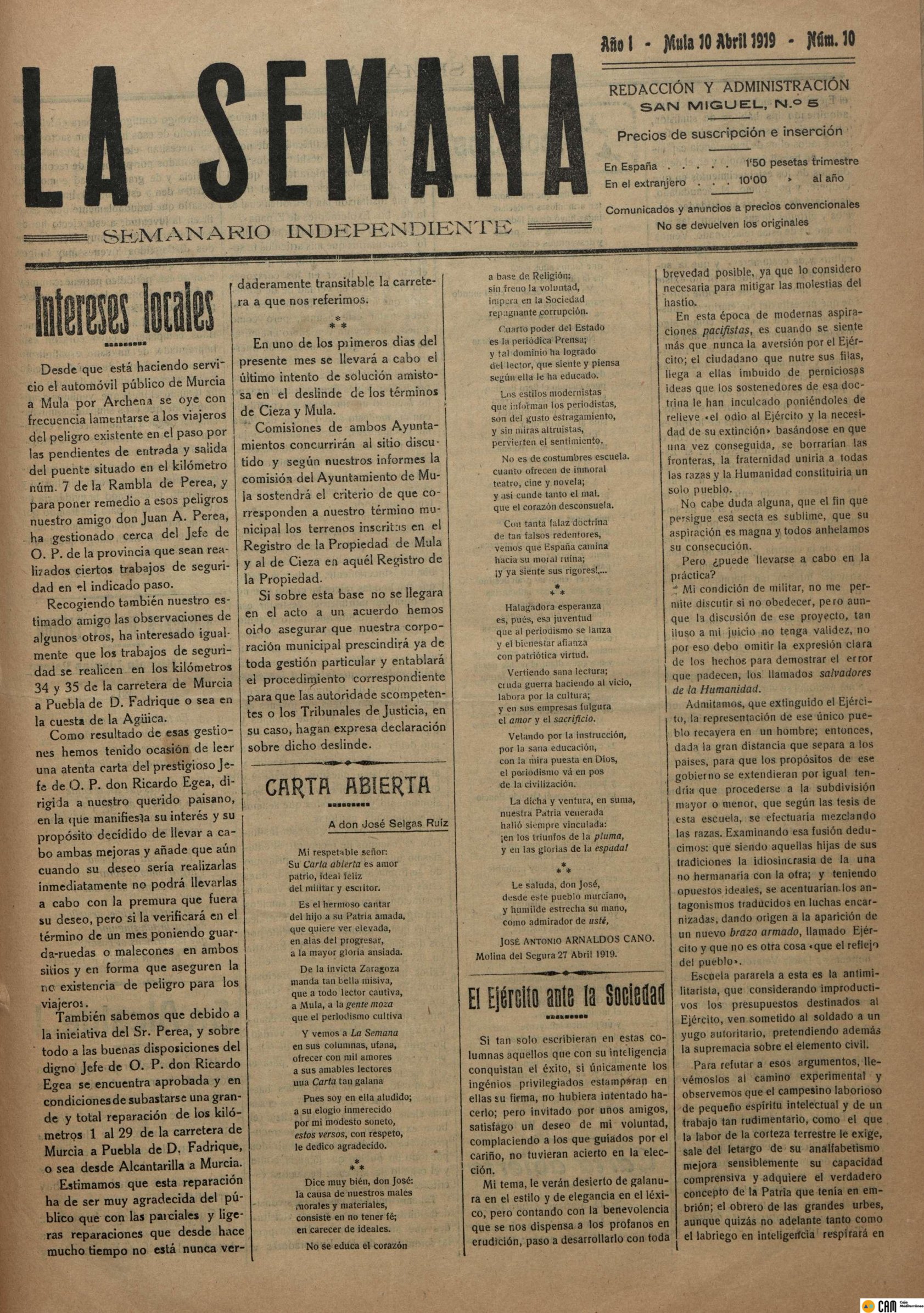 Periodico de Mula La Semana nº10 10 de Abril de 1919