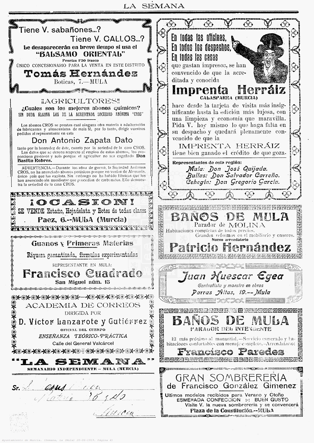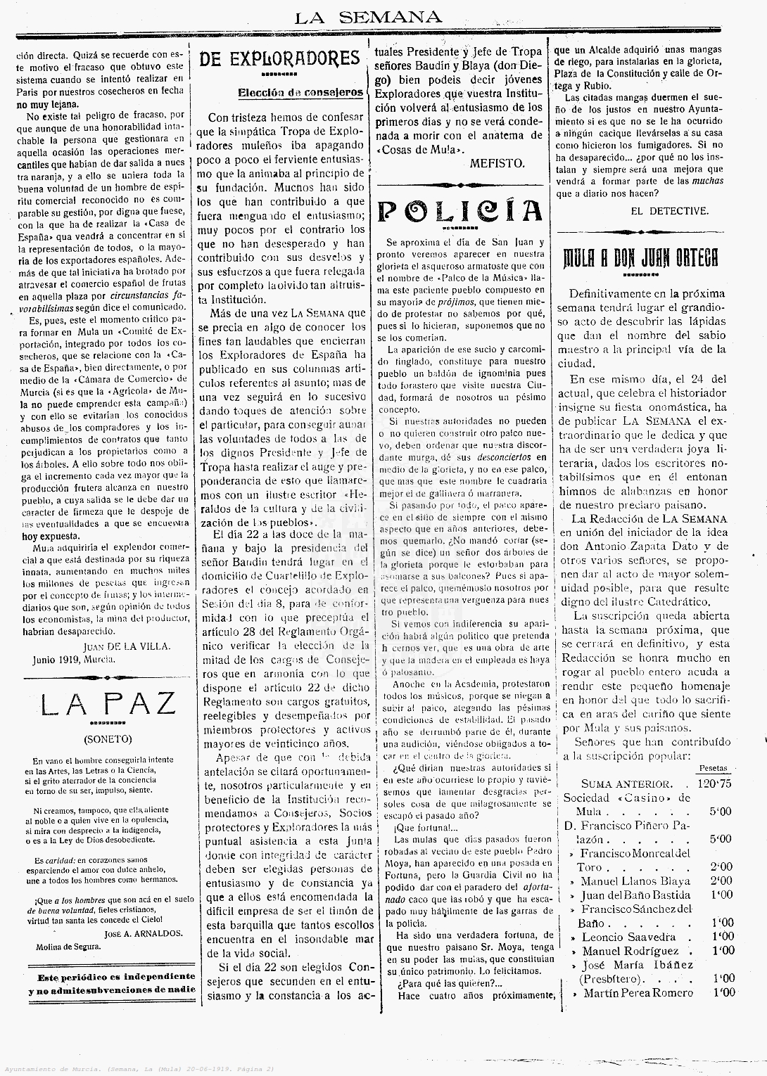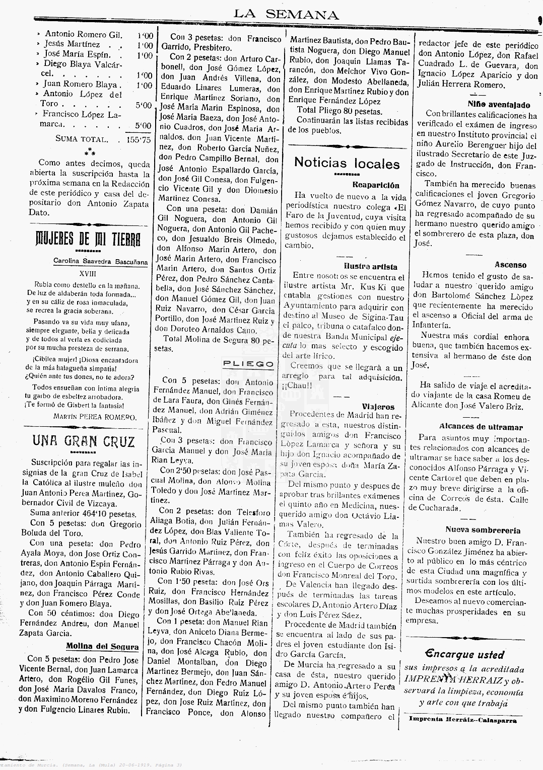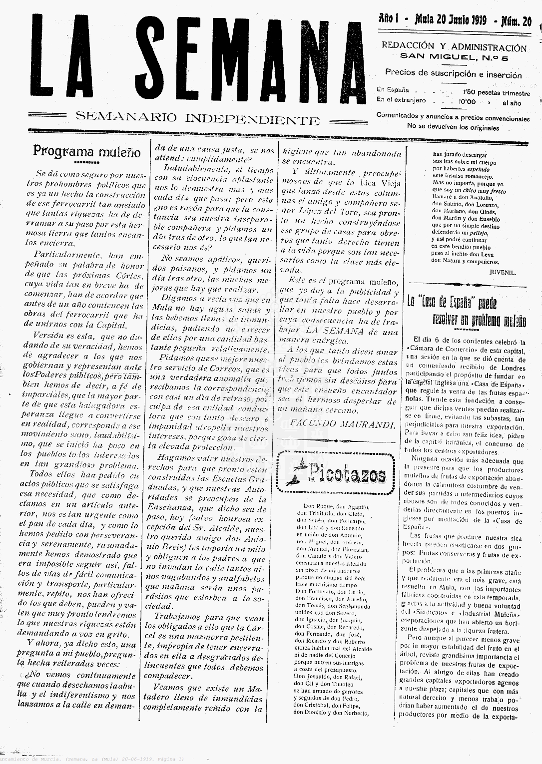 Periodico de Mula La Semana nº20 20 de Julio de 1919