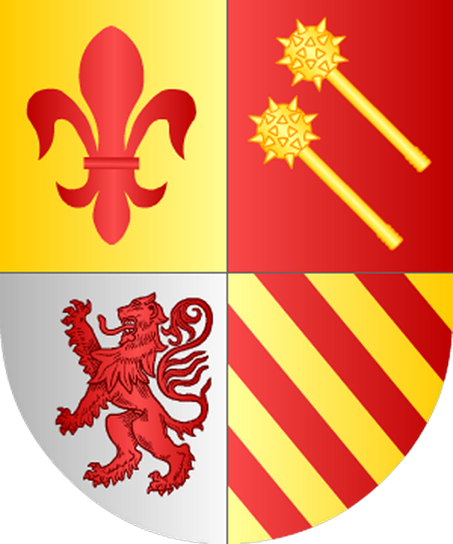 Escudo cuartelado: 1º en campo de gules, una flor de lis de oro; 2º en campo de gules, dos mazas de oro; 3º en campo de plata, un león rampante de gules; 4º en campo de plata, cuatro palos de gules o palos de Aragón.