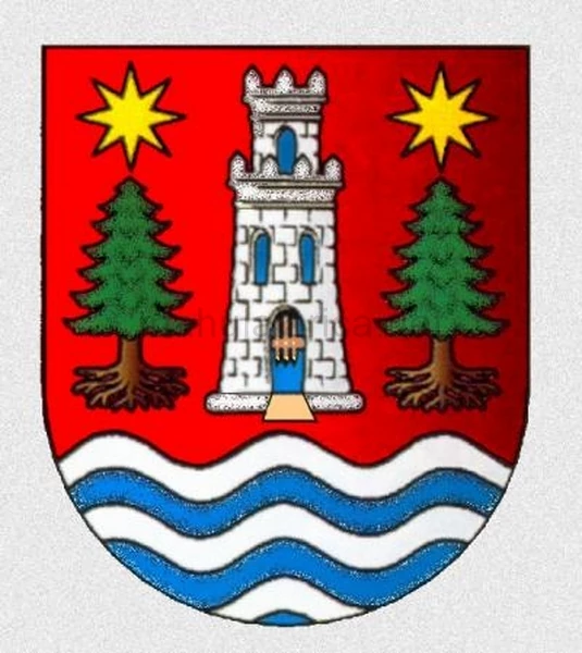 Trae en campo de gules, una torre de plata aclarada de azur, puesta sobre andas de agua de plata y azur, y acostada de dos pinos de sinople, uno a cada lado, surmontados de sendas estrellas de oro de ocho puntas.