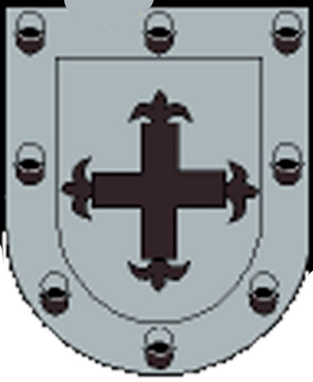 En campo de plata una cruz floreteada de sable y dentro del escudo a modo de orla ocho calderas de sable.