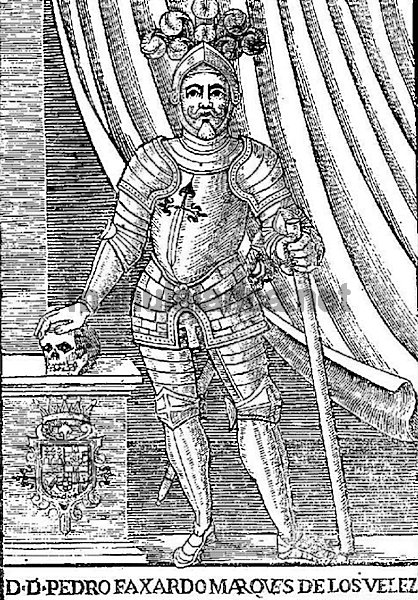 II .- Pedro Fajardo y Chacón . Nació ~ 1478 y falleció en  1542 El 12 Sep.1507 la reina  Juana I de Castilla le concedió el Marquesado de Los Vélez, en compensación  por la incorporación del Señorío de Cartagena a la Corona de Castilla, V señor de Molina de Segura, Adelantado mayor y Capitán general del Reino de Murcia y Lorca, Comendador de Caravaca y de León , Trece de la Orden de Santiago, Miembro del Consejo de los Reyes Católicos y Contínuo de su Casa entre otros títulos. Mandó construir en 1506 el castillo de Vélez Blanco, en Almería. Casado en primeras nupcias con Magdalena Manrique, matrimonio que fue anulado por no tener sucesión y en segundas con Mencía de la Cueva y Mendoza  hija del II Conde de Alburquerque.