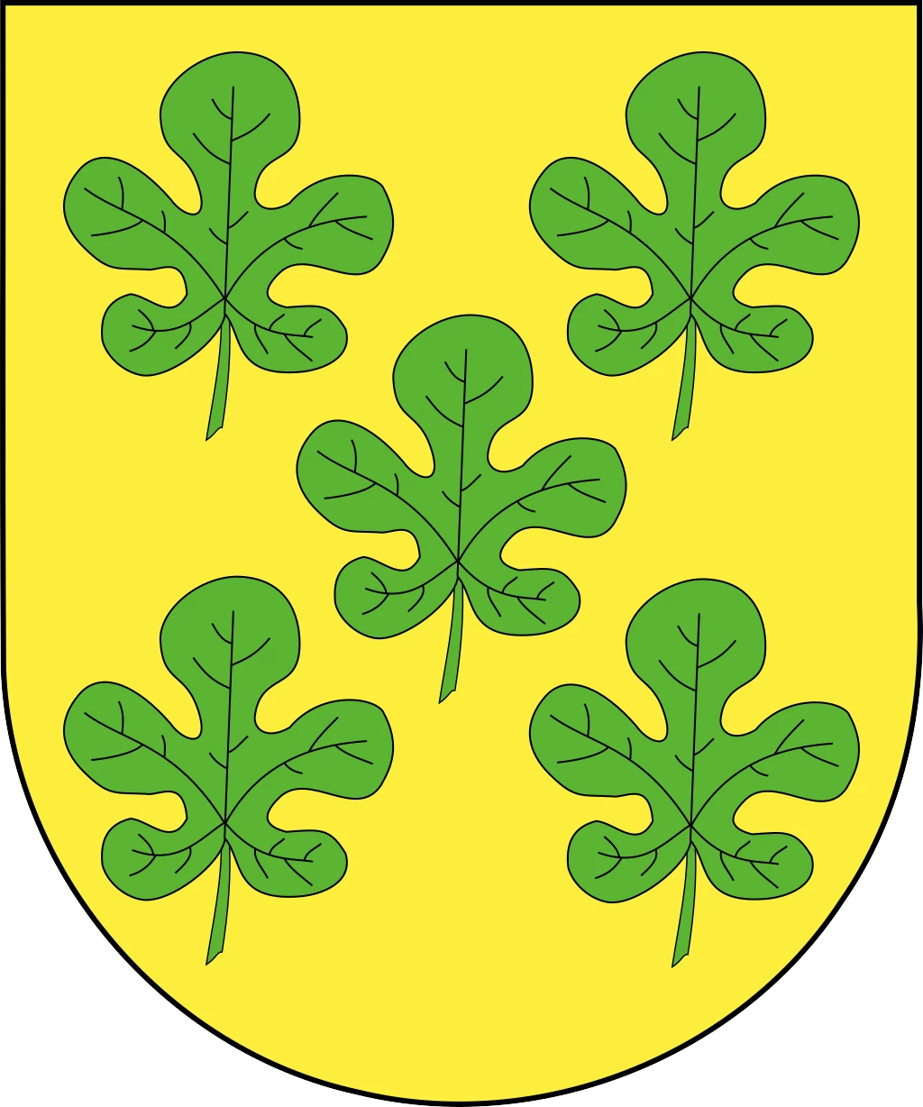 En campo de oro, cinco hojas de higuera de sinoples puestas en sotuer. Bordura de gules con cadenas de oro.