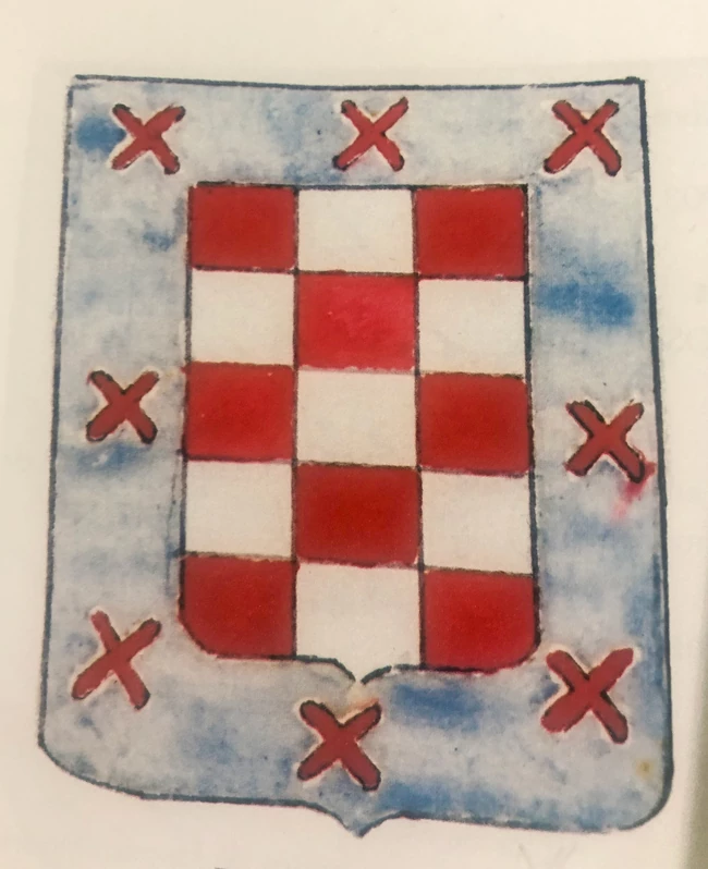 Ajedrezado en 15 cuarteles de plata y gules, partido de dos líneas y cortado de cuatro. Bordura de azur con ocho aspas o sotueres de gules.