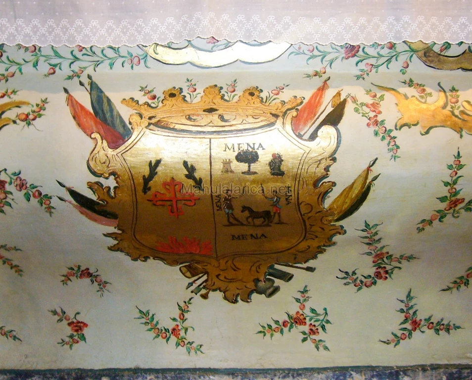 Mena: en campo de oro un caballo de sable flanqueado por dos guerreros armados,enfrentados y con las espadas desnudas,el guerrero de la diestra coronado. El jefe de oro, un árbol de sinople, flanqueado a su diestra de un yelmo y a su siniestra de una torre donjonada. En el contorno del escudo,el lema MENA en cada uno de sus lados.