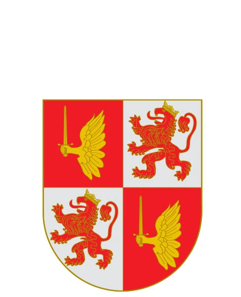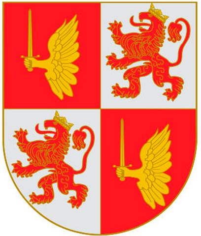Escudo cuartelado 1º y 4º de gules y un brazo alado de oro armado con espada de plata y 2º y 3º de plata y un León rampante de gules.