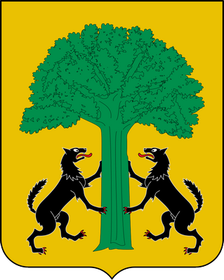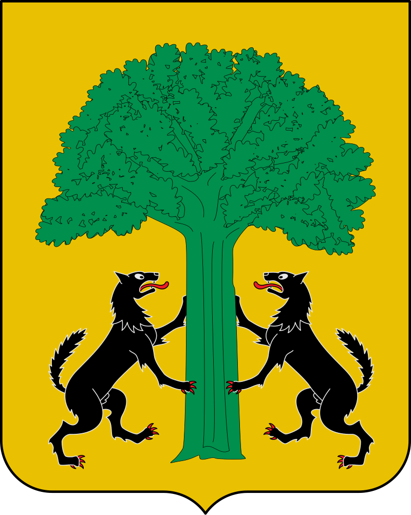 En campo de oro un roble con las raíces sanguíneas y dos leones con las manos en el roble. En el escudo de la imagen aparecén 2 lobos.