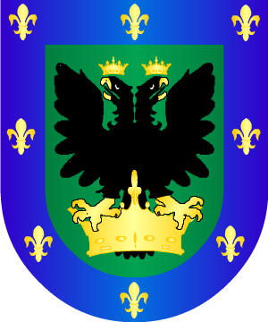 Sinople, con águila de sable de dos cabezas, coronadas de oro, picada y membrana del mismo metal y puestas las garras sobre otra corona grande, también de oro, bordura de azur, con ocho flores de lis de oro.