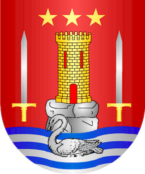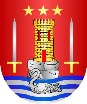 En campo de gules, la punta de ondas de plata y azur; sobre éstas y resurgiendo de ellas, un cisne de plata. Tras el cisne, una torre de oro sobre unas rocas de plata, surmontada la torre de tres estrellas de oro puestas en faja y acostada de dos espadas de plata encabadas de oro y puestas con la punta hacia arriba, una a cada uno de sus costados.