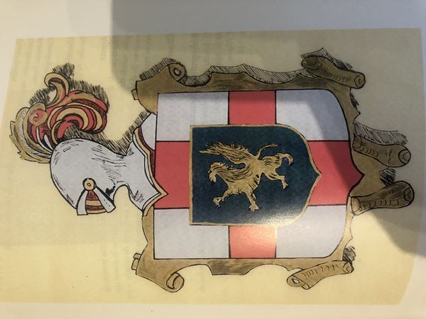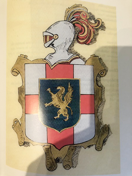 De sinople, con un grifo de oro, bordura campanada de ocho piezas de plata y gules, cuatro de cada esmalte.