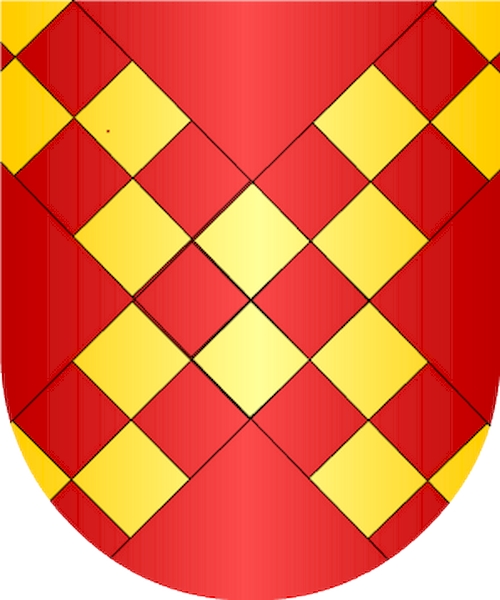 Escudo de gules con un aspa compuesta de dos hileras de jaqueles de oro y gules