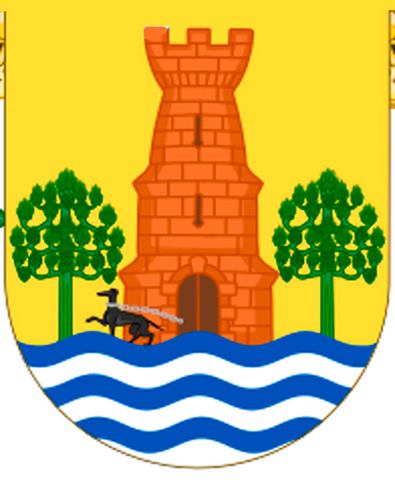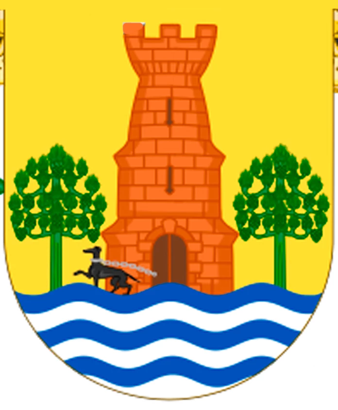 En campo de oro, un castillo o torre al natural aclarado de azur o de gules, puesto sobre ondas de agua de azur y plata y acostada de dos pinos o de dos cipreses, frutados de oro. Al pie del castillo y atado con una traila, o cadena de oro, a la aldaba de la puerta, un perro andante de sable, con manchas de plata.