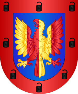 En campo de azur, un águila exployada, palada de cuatro piezas de oro y gules; bordura de gules, con ocho candados abiertos de sable.