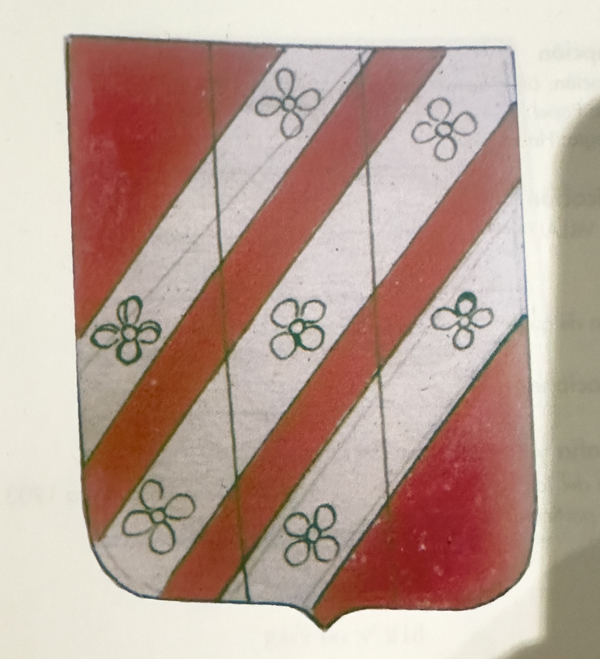 En campo de gules tres traversas gemelas de plata cargadas con flores de cuatro hojas,tres centrales , dos y dos en los extremos.