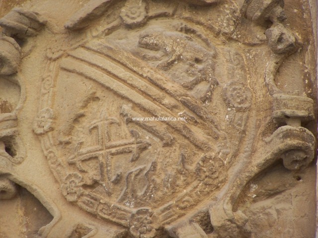 Bordea el campo de todo el escudo un collar con ocho rosas que en realidad es la orla de oro con ocho rosas encarnadas de las armas de Resalt.