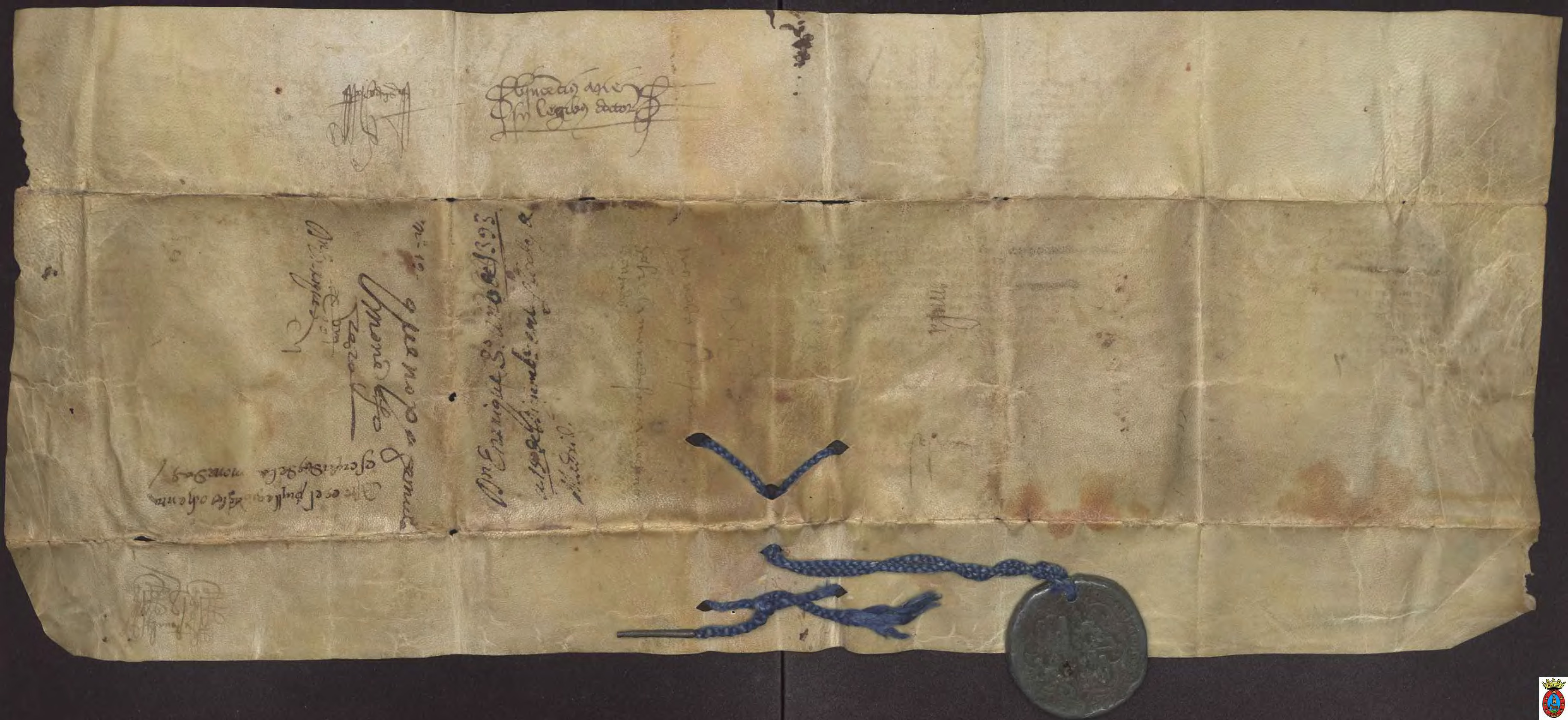 Pergamino con Real Sello de plomo pendiente. 61 x 26 cm. Deteriorado en aquellas partes por donde estaba doblado. Falta la S inicial del texto. A. M. de Mula. Carp. 1 de privilegios.