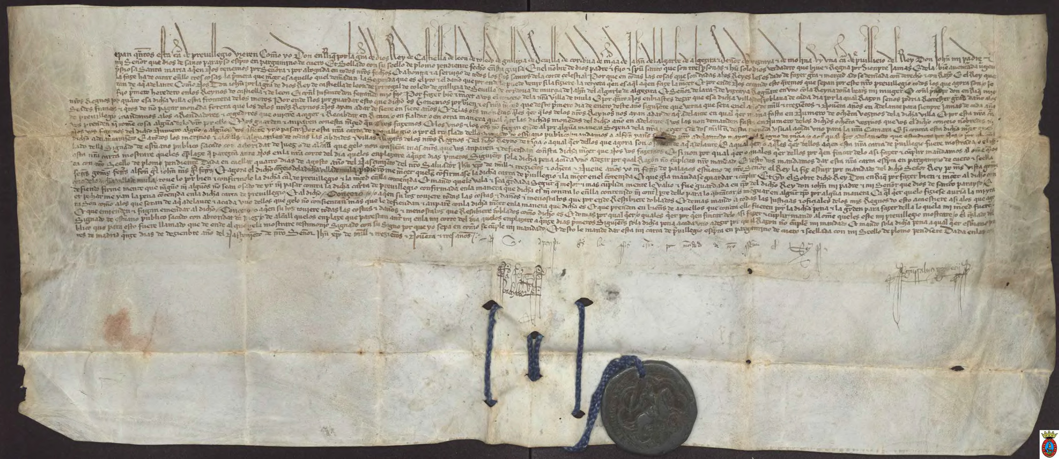 Confirmación mandada hacer por el rey Enrique III de una carta de privilegio de su padre, el rey Juan I de Castilla, dada en Cuellar a 4 de Agosto de 1389, por la que se concede a la villa de Mula la franquicia de la moneda forera y cualquier otra hasta en número de ochenta vecinos, elegidos por el Concejo.