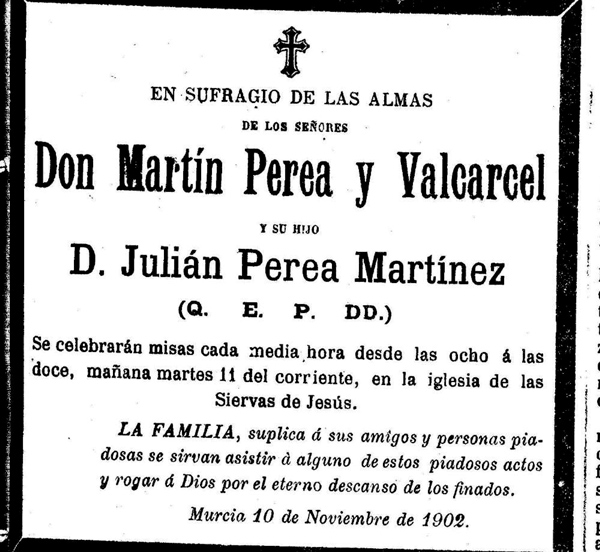 Juan Martin Perea y Valcárcel fue jefe local del partido conservador lo que le permitió acceder a los cargos de Alcalde de Mula, diputado provincial y Gobernador Civil de Albacete y Murcia. Desgraciadamente falleció a la temprana edad de 49 años en 1902 (Historia de Mula de Antonio Sánchez Maurandi, Tomo IV, págs. 145 y 146).