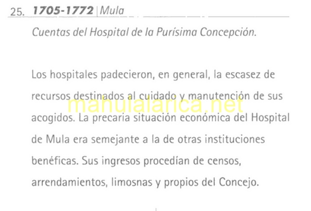 Este antiguo hospital a través de la cofradía de la Purísima Concepción, daba asistencia caritativa a los enfermos por las epidemias existentes en la zona en aquellos momentos. El edificio constaba de varios patios, huerto y cementerio. En el siglo XVIII se remodela el mismo, construyendo la portada de acceso existente actualmente, en la que se puede ver el relieve de la Purísima Concepción, y unos versos haciendo referencia al tema hospitalario del edificio.