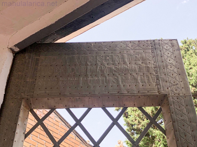 Fue ornada con cipreses y abierta a la puerta de acceso,cuya cancela es la que había en el cementerio viejo,fechada en octubre de 1859 en la hoja derecha,mientras en la izquierda se grabo un resumen del conocido pasaje del libro de Ruth(1:8),que,traducido del latín,dice Dios tenga misericordia con vosotros,como vosotros la tuvisteis con los muertos. Es posible que la portada,tallada en piedra de la Puebla,correspondiera,igualmente,a la de aquél.