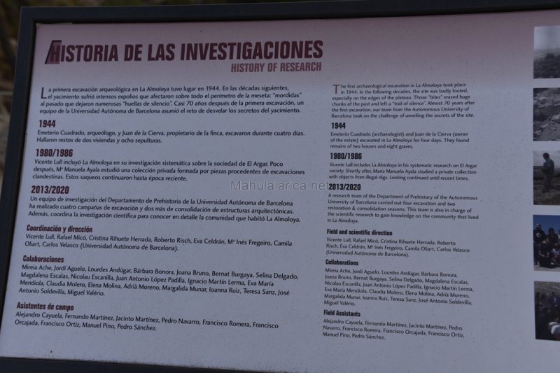 Fue, seguramente, uno de los más importantes asentamientos de la cultura argárica. Sus restos están situados sobre un cerro allanado que domina un extenso terreno de monte bajo. Se trata de un emplazamiento estratégico privilegiado que favoreció su ocupación durante más de 600 años, entre 2200 y 1550 a.C. El yacimiento fue dado a conocer en 1944 por Emeterio Cuadrado y Juan de la Cierva.