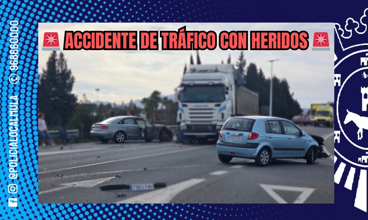 Esta tarde, en torno a las 15:30 horas, Policía Local de Mula ha intervenido en un accidente de tráfico con varios vehículos implicados ocurrido en la RM-516.