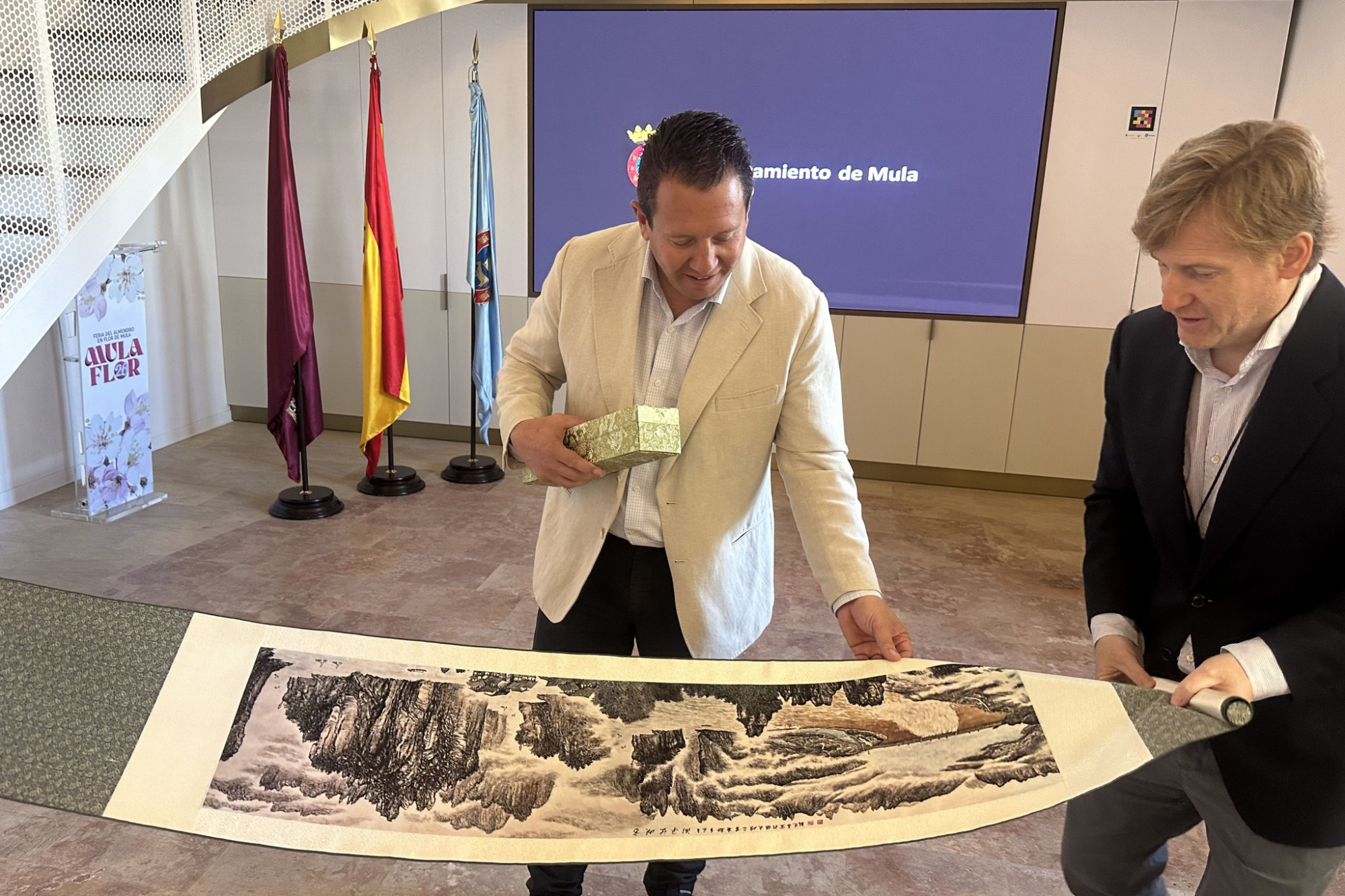 El acto incluyó un intercambio de obsequios cargado de simbolismo: la delegación china entregó al alcalde un pergamino horizontal elaborado en seda, representativo de la energía y la abundancia de su cultura, mientras que el Ayuntamiento correspondió con un emblema de MulaFlor, obra del presidente de RuralMur, que evoca el almendro en flor como seña de identidad, patrimonio natural y motor de desarrollo del municipio.