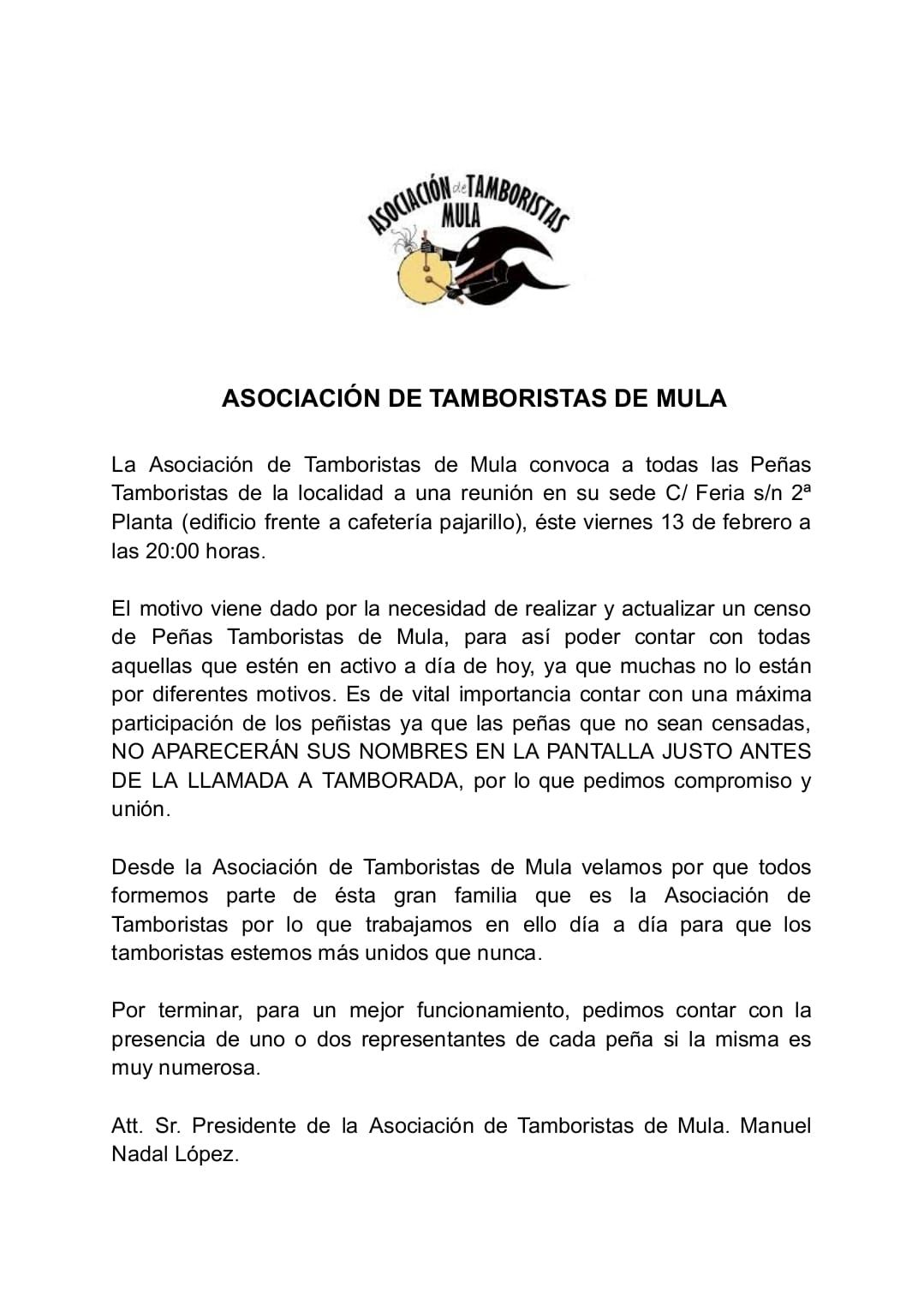Creemos necesario hacer un censo de peñas e involucrar a las mismas en la asociación de tamboristas y en sus actividades. La finalidad es actualizar los nombres de las peñas que salen en las pantallas de la plaza justo antes de la llamada a tamborada ya que creemos que en la actualidad está desfasada. Hay peñas que ya no existen y otras muchas existentes que no aparecen. Para ello vamos a hacer una reunión el próximo viernes en nuestra asociación con la finalidad de informar al respecto.