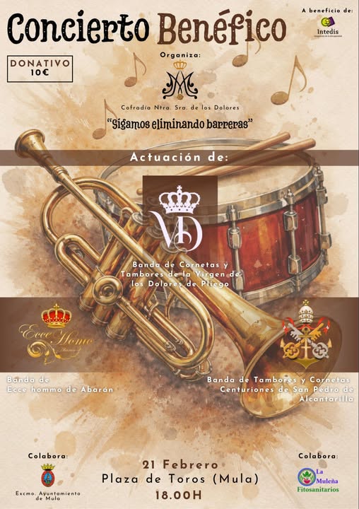 El 21 de febrero y en la plaza de toros de Mula, a las 18 h, concierto beneficio de bandas de tambores y cornetas.