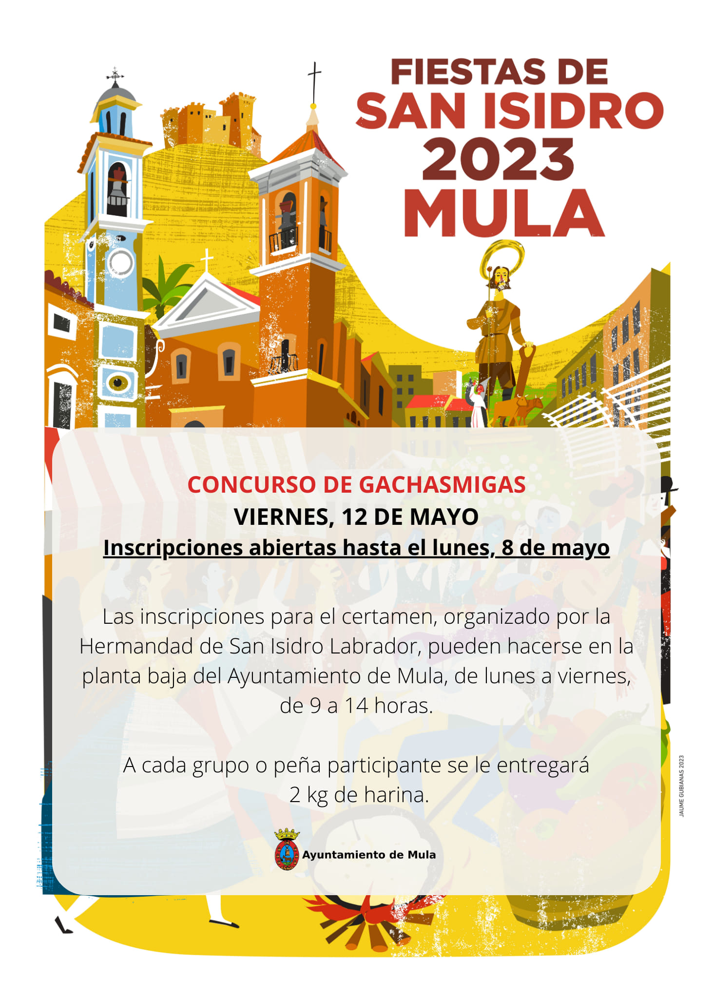 Las inscripciones para el Concurso de gachasmigas (viernes, 12 de mayo), organizado por la Hermandad de San Isidro Labrador, pueden hacerse en la planta baja del Ayuntamiento de Mula, de lunes a viernes, de 9 a 14 horas. A cada grupo o peña participante se le entregará 2 kg de harina.El plazo de inscripción está abierto hasta el lunes, 8 de mayo.