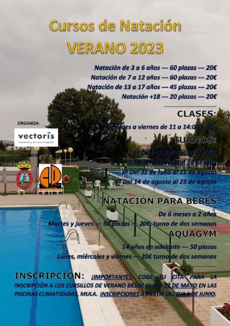 A partir del lunes, 22 de mayo, en las instalaciones de la piscina climatizada de Mula, puedes coger tu cita para inscribirte en los cursos de natación que se van a impartir durante este verano. Las inscripciones se realizarán a partir del jueves, 1 de junio.
