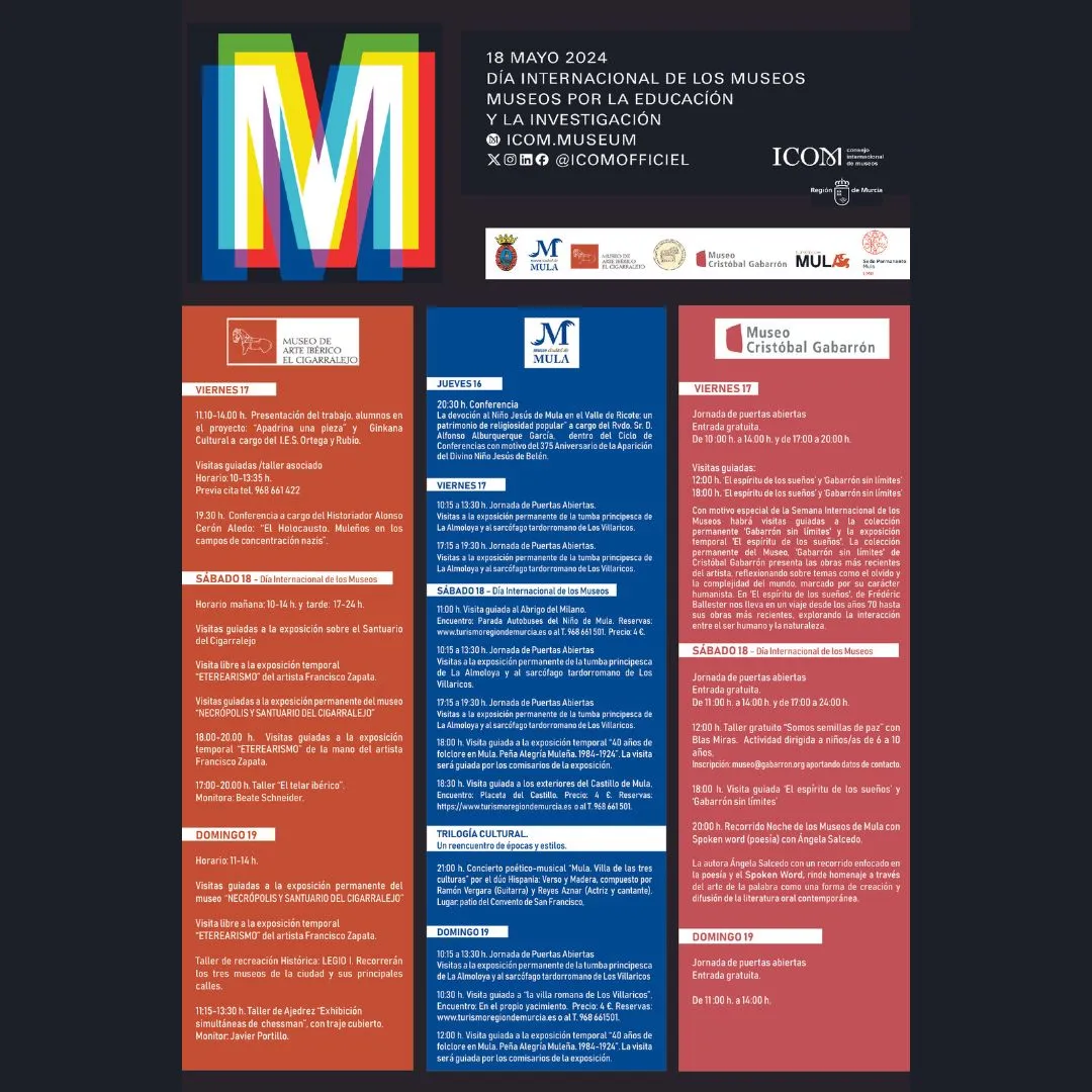 Los museos de Mula: El Museo de Arte Ibérico El Cigarralejo, Museo Cristóbal Gabarrón y Museo Ciudad de Mula, han preparado un programa repleto de actividades que se desarrollarán durante todo el fin de semana, del 17 al 19 de mayo.