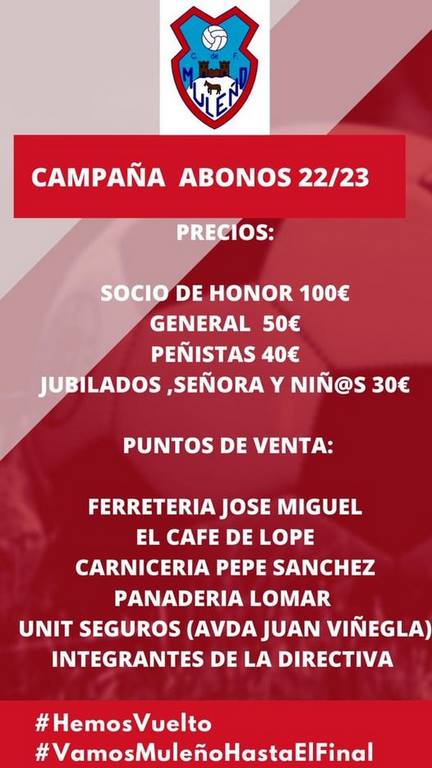 La directiva del Muleño c.f,acaba de publicar los precios de los carnets de los abonos para los aficionados para esta temporada 2022-2023.Estos son.