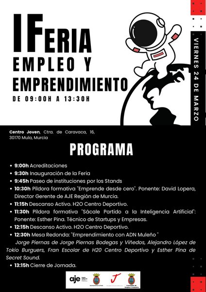 El viernes, 24 de marzo, en el Centro Joven, tendrá lugar la I Feria de Empleo y Emprendimiento de Mula dirigida a los jóvenes del municipio.