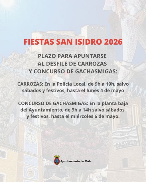 Con la proximidad de las Fiestas de San Isidro 2026, el Ayuntamiento de Mula ha abierto el plazo de inscripción para dos de las actividades más populares y participativas de la programación festiva: el desfile de carrozas y el tradicional concurso de gachasmigas.