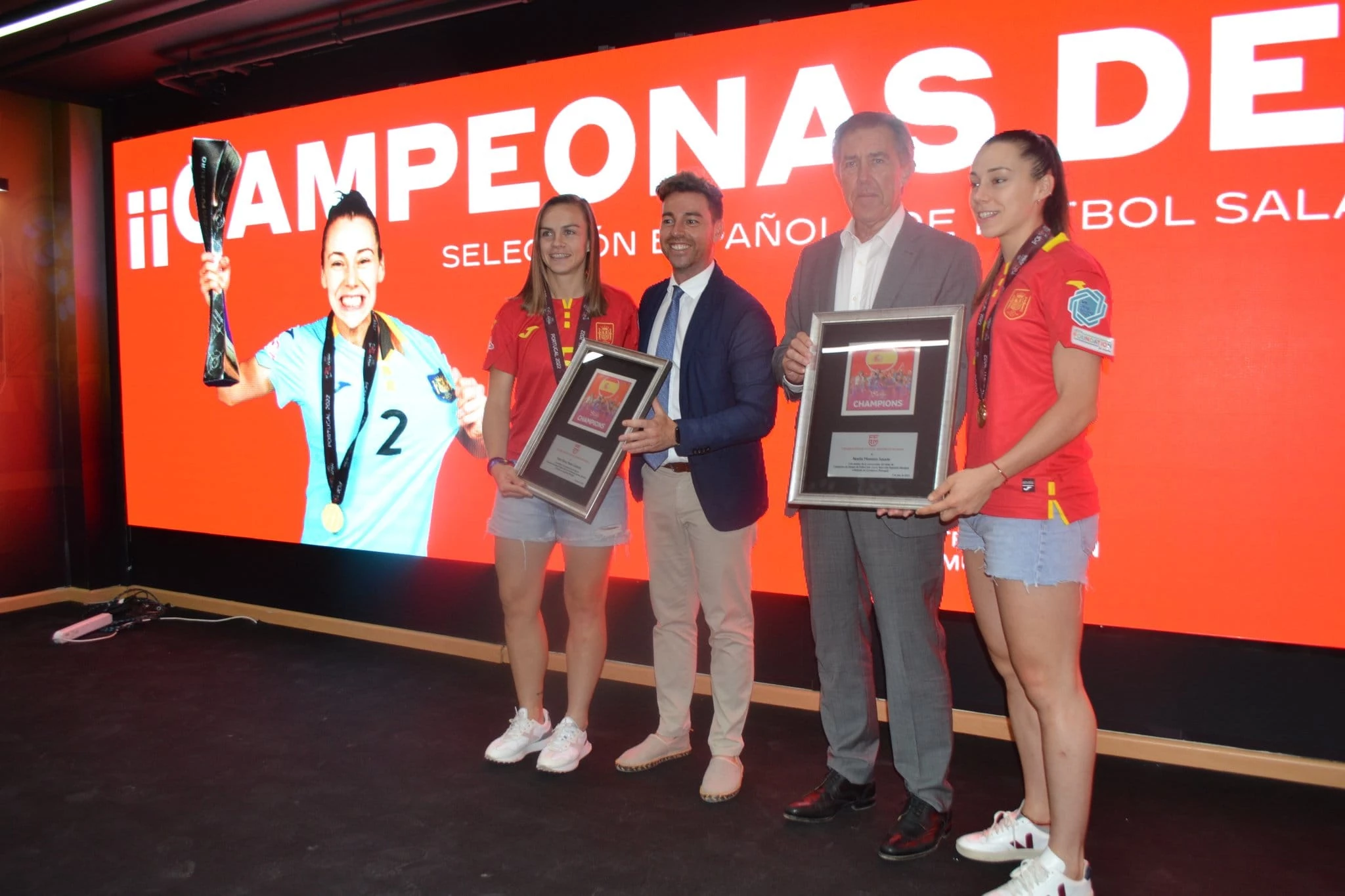Mayte Mateo y Noelia Montoro,jugadoras murcianas integrantes de la selección española de fútbol sala que hace unas fechas se alzaron con el título de campeonas de Europa 2022, en la ciudad portuguesa de Oporto,an sido recibidas está mañana por el presidente de la Federación Murciana de Fútbol, José Luis Monje Carrillo,quien a destacado el buen quehacer de las dos jugadoras tanto de la muleña Noelia Montoro " Noe", como la de su compañera Mayte Mateo
