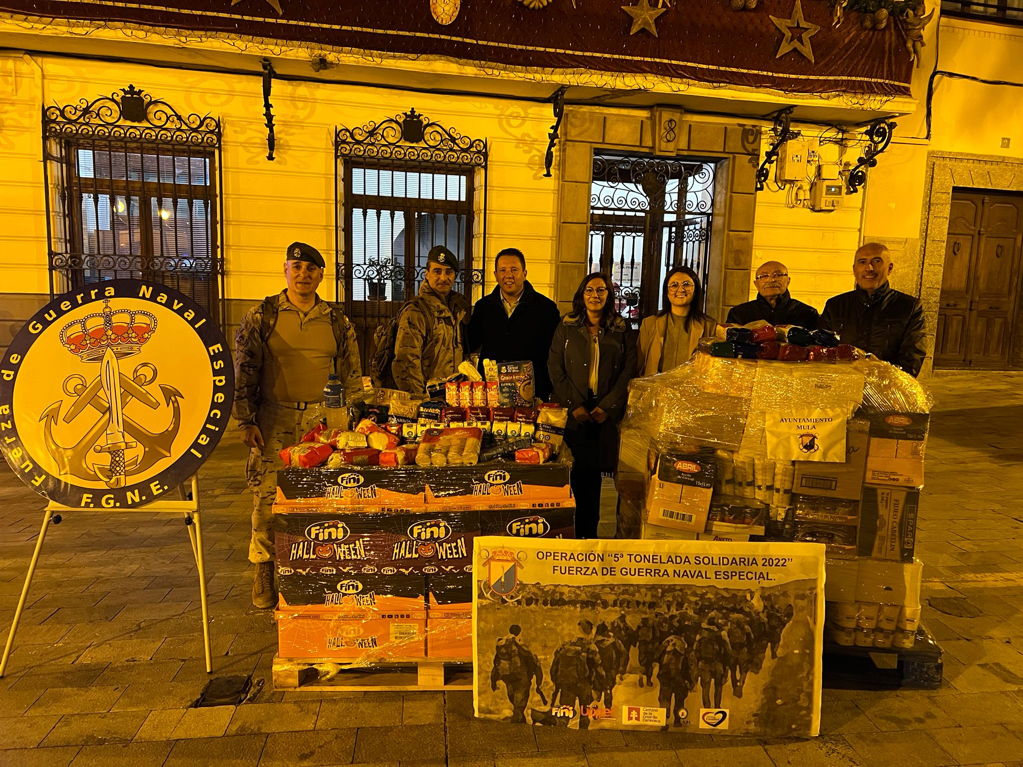 Esta madrugada del jueves, 15 de diciembre, el alcalde de Mula Juan Jesús Moreno y miembros del equipo de gobierno han recibido a la Unidad de Fuerza de Guerra Naval Especial, quienes han traído un cargamento de alimentos destinados al Programa de Alimentos del Ayuntamiento de Mula.