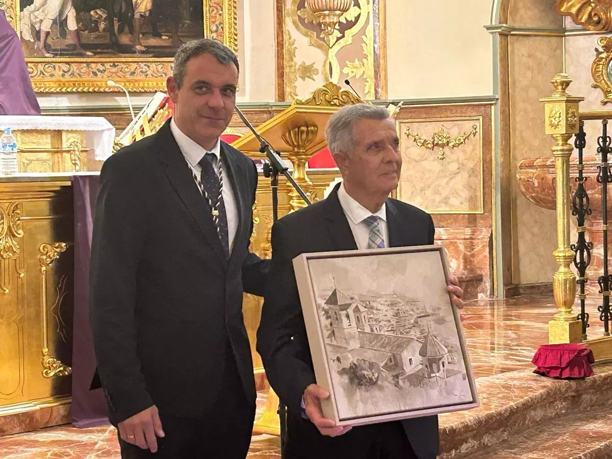 El alcalde de Mula, Juan Jesús Moreno, hacía entrega al Pregonero de un cuadro como recuerdo del momento.